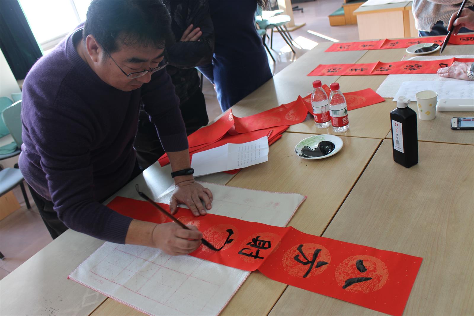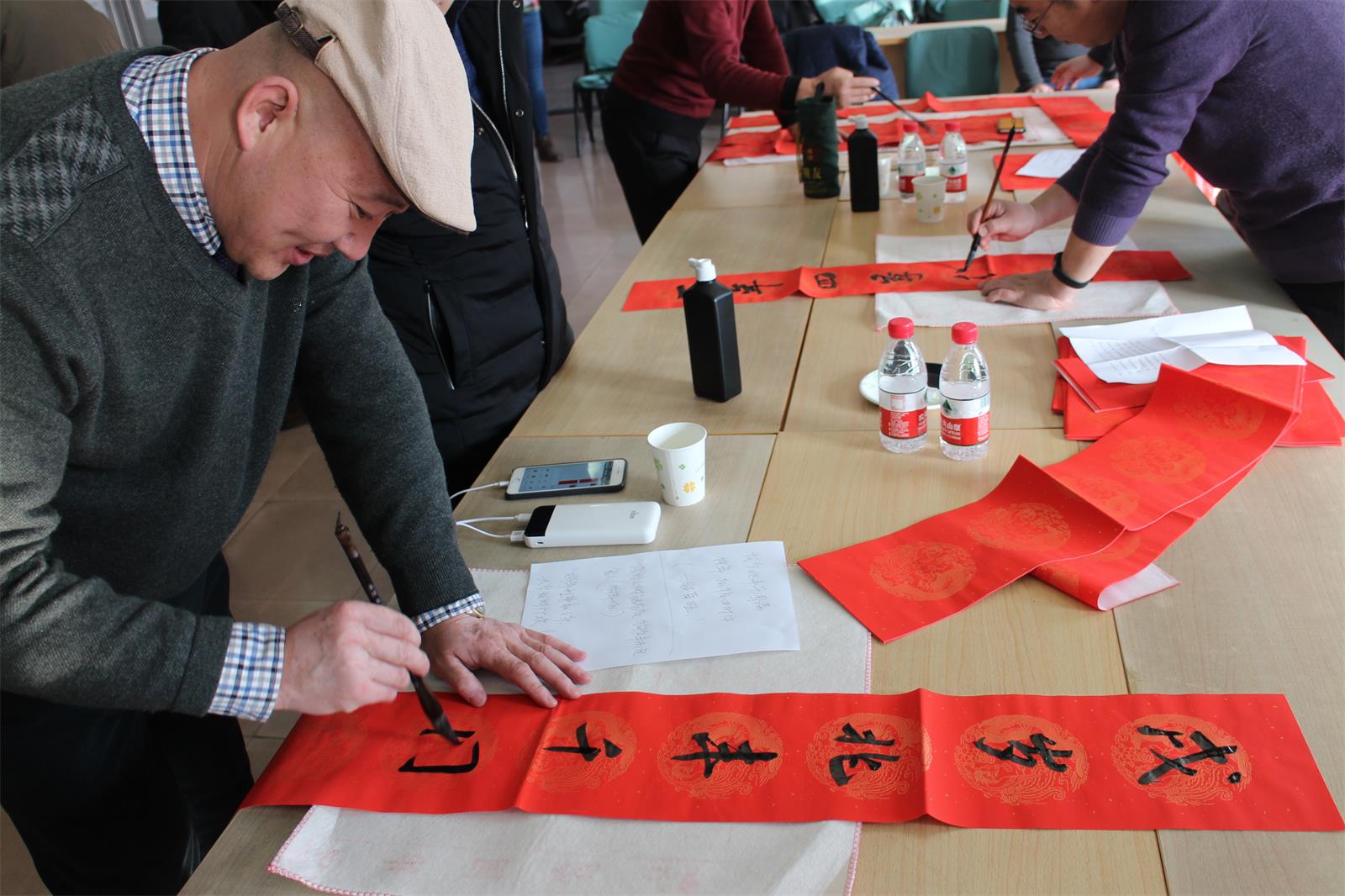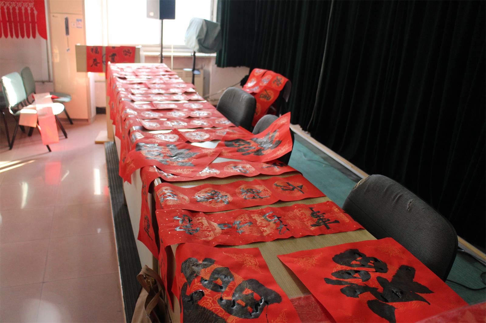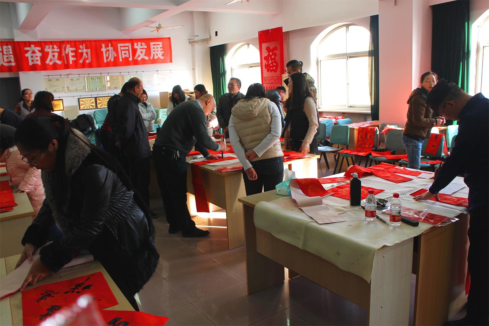 今年當(dāng)然也不能例外!2月2 日下午15 點(diǎn)至 17 點(diǎn)30分,市書法家協(xié)會(huì)的多位優(yōu)秀書法家準(zhǔn)時(shí)來到五樓會(huì)議室為本院職工們免費(fèi)書寫春聯(lián),大伙兒熱情很高, 現(xiàn)場氣氛歡快,不一會(huì)兒各色字體,不同內(nèi)容的大紅春聯(lián)就鋪滿了各個(gè)角落。